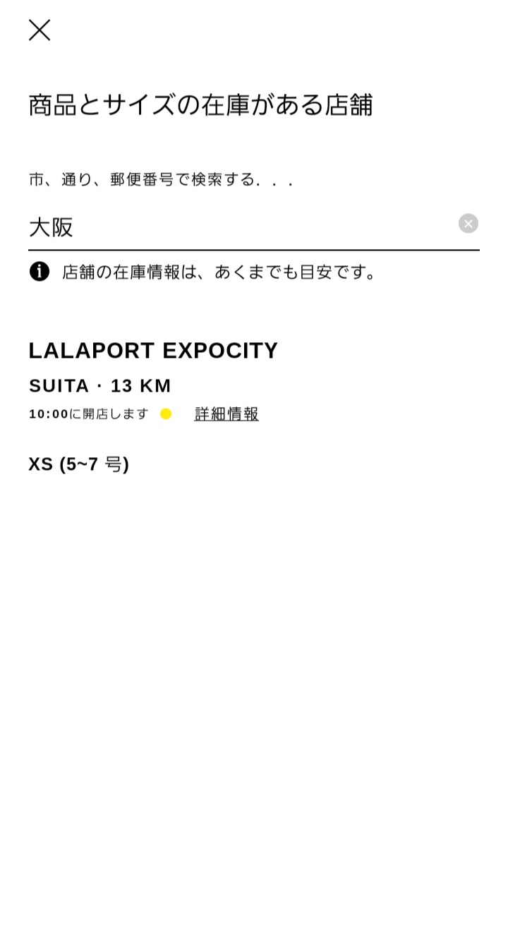 大阪府吹田市のららぽーとEXPOCITY にxsサイズの在庫があるそうなので(アプリからの在庫確認)、代行をお願いしたいです。 在庫は店舗のバックヤードにある場合もありますので商品番号2712/213を店員さんにお伝えいただくとスムーズと思います。